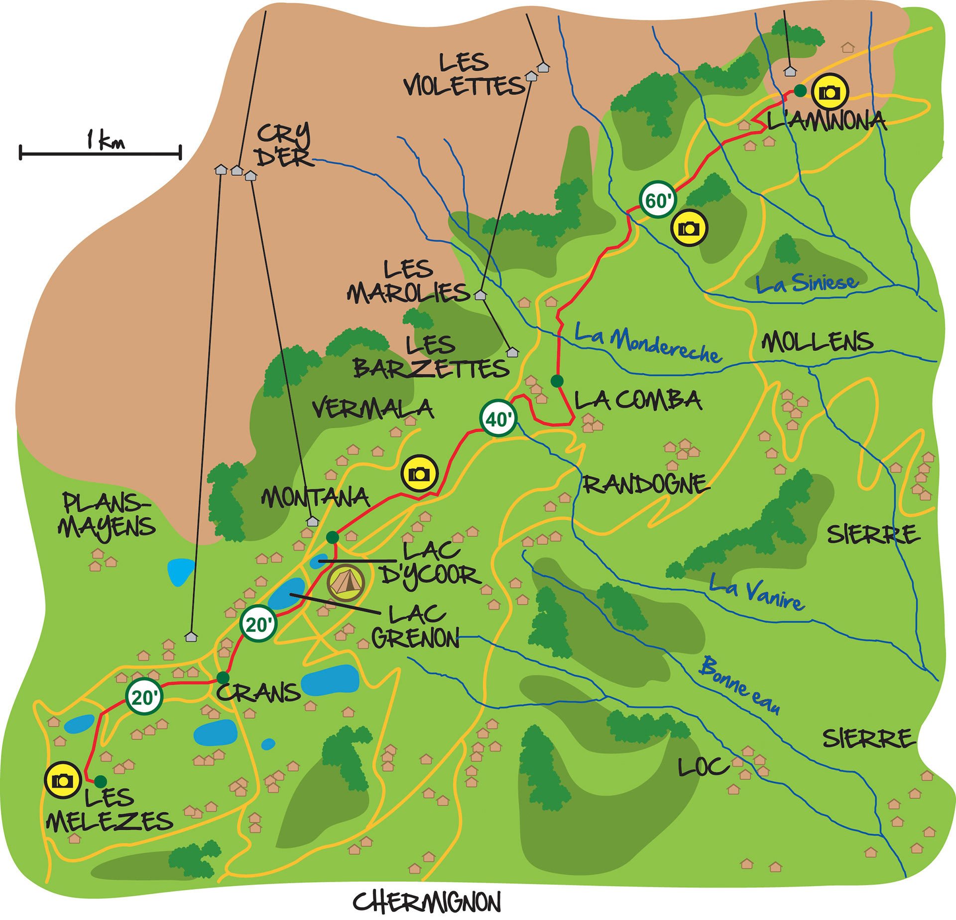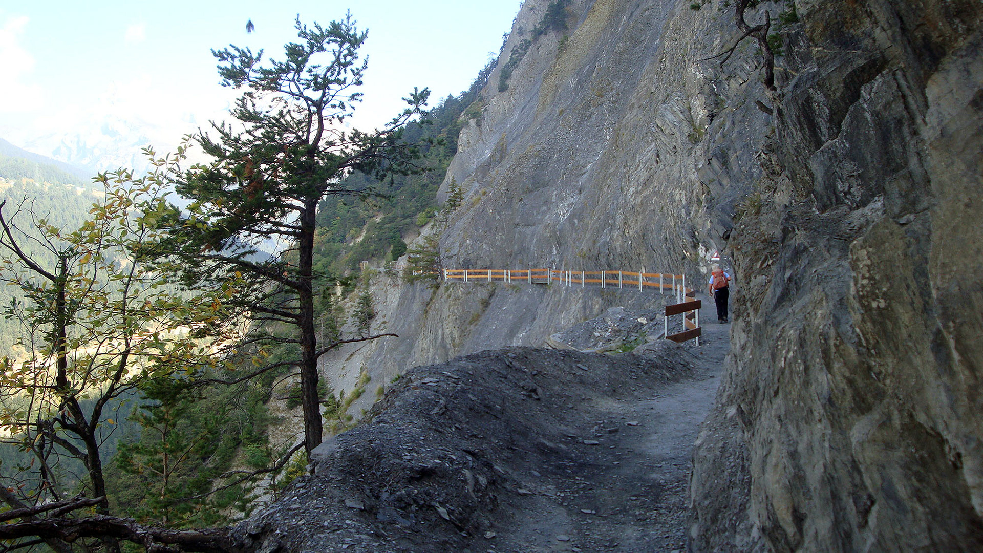 Il s’agit là d’une promenade ombragée (environ 3 heures aller-retour), en pente très douce et peu accidentée, donc très accessible. Le point de départ se situe 100 mètres après la sortie du village de Venthône, sur la gauche, après l'indication "Communauté Les Béatitudes". On peut laisser la voiture sur le chemin des Barmettes, sur la gauche après l'arrêt du bus en contre-haut, ou sur le chemin de terre situé en contre-bas dans le virage en épingle à cheveux. En suivant le bisse, on trouve des panneaux didactiques rédigés en 4 langues (français, allemand, italien et anglais). Cet aménagement a été réalisé grâce à l'action des collectivités riveraines. Le Bisse Neuf prend son eau dans le Raspille, limite entre le Haut et le Bas-Valais. On peut combiner cette promenade avec la visite de Planige et son sentier naturel.