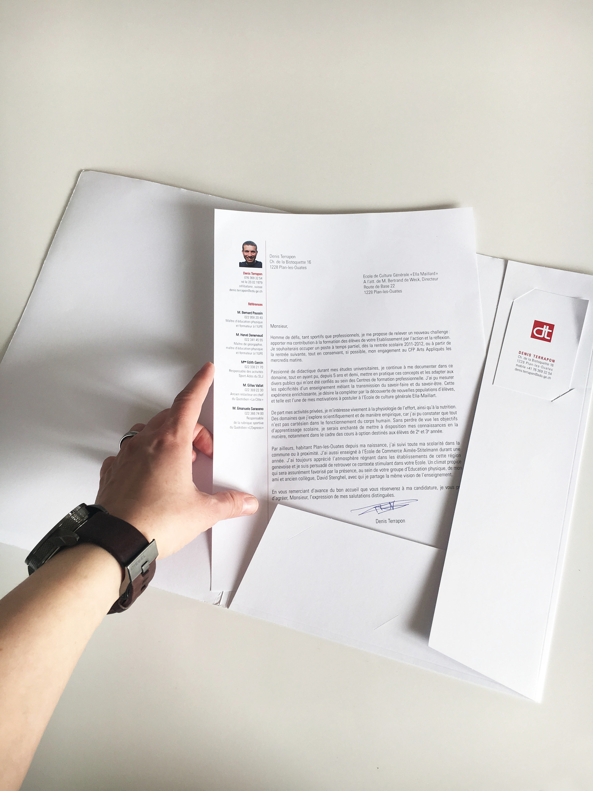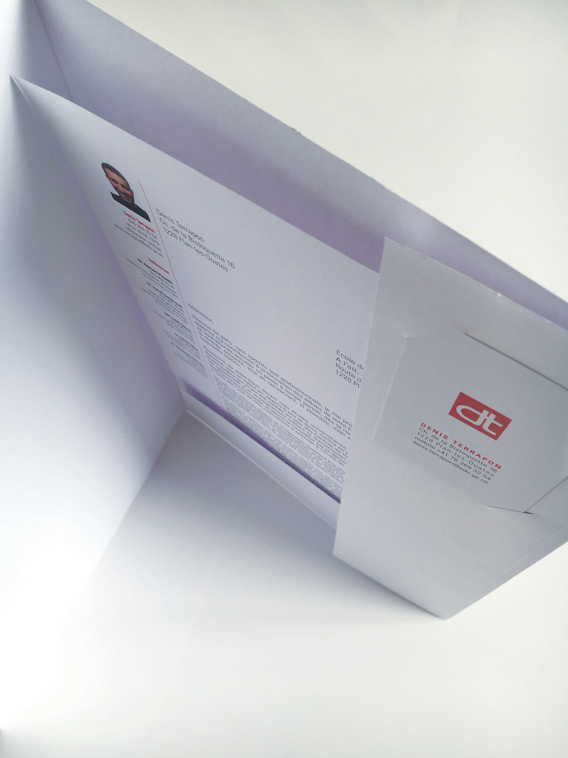 Curriculum Vitae présenté dans une fourre pour documents avec encart pour carte de visite.