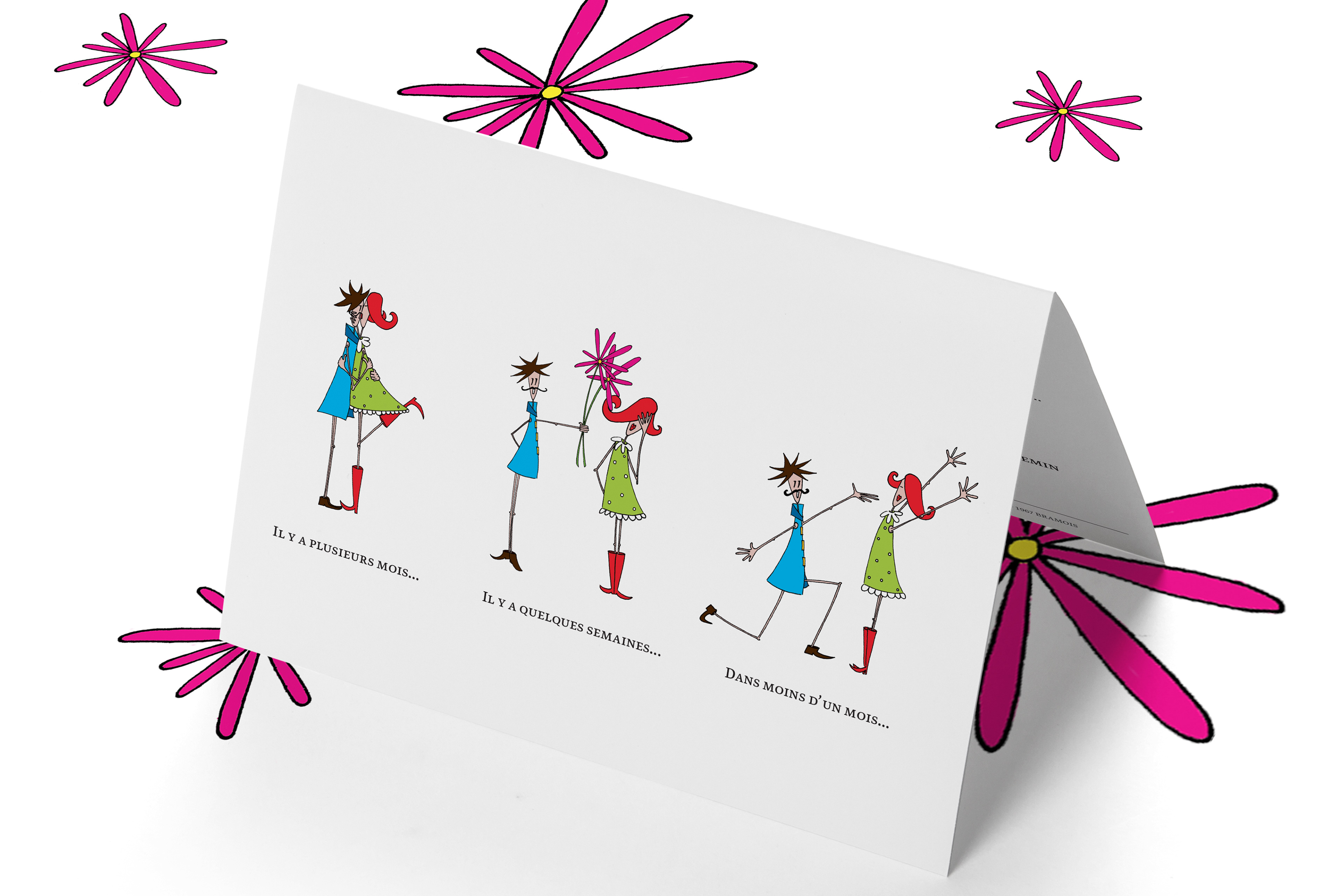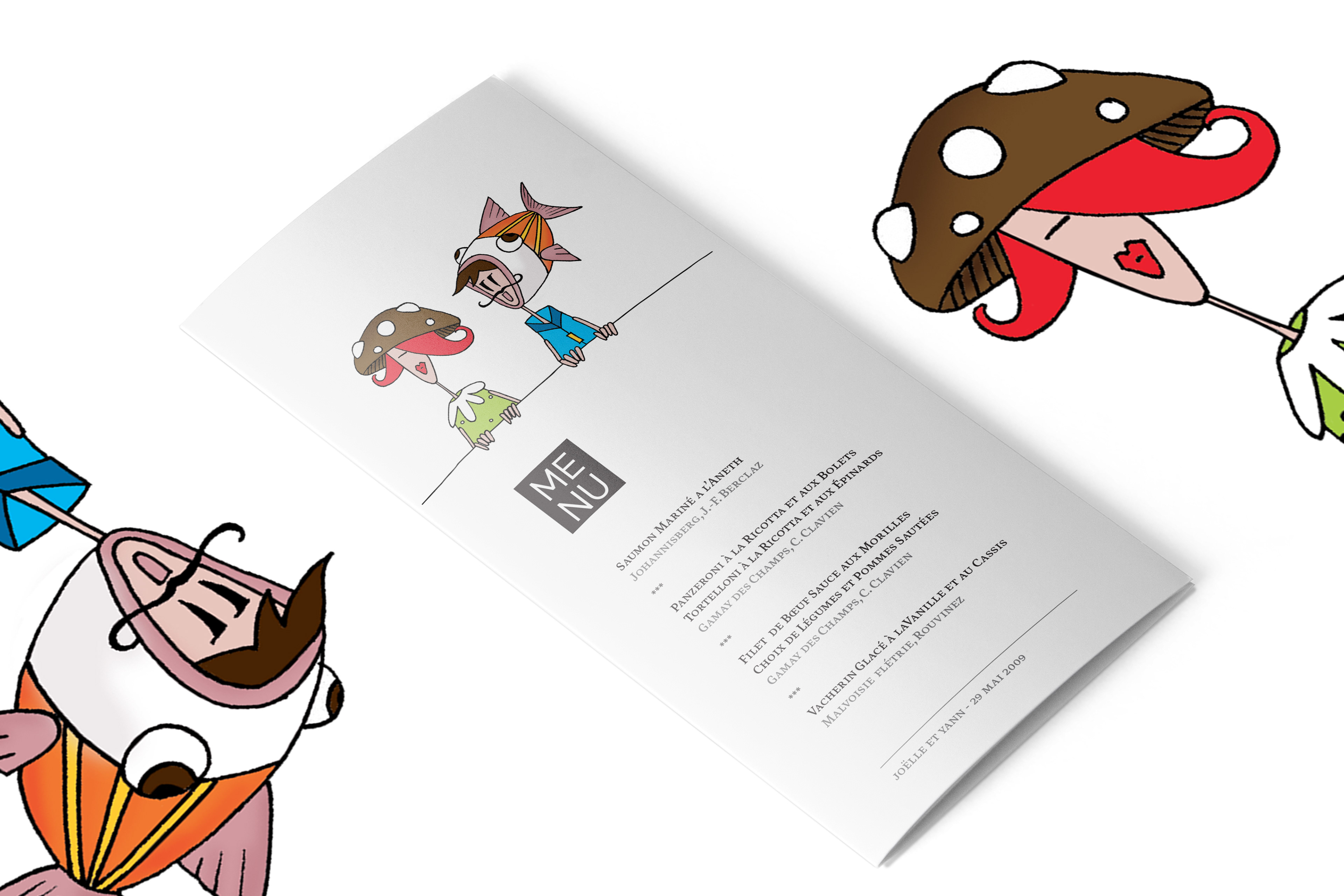 Réalisation d'illustrations pour un mariage : faire-part, menus, étiquettes.